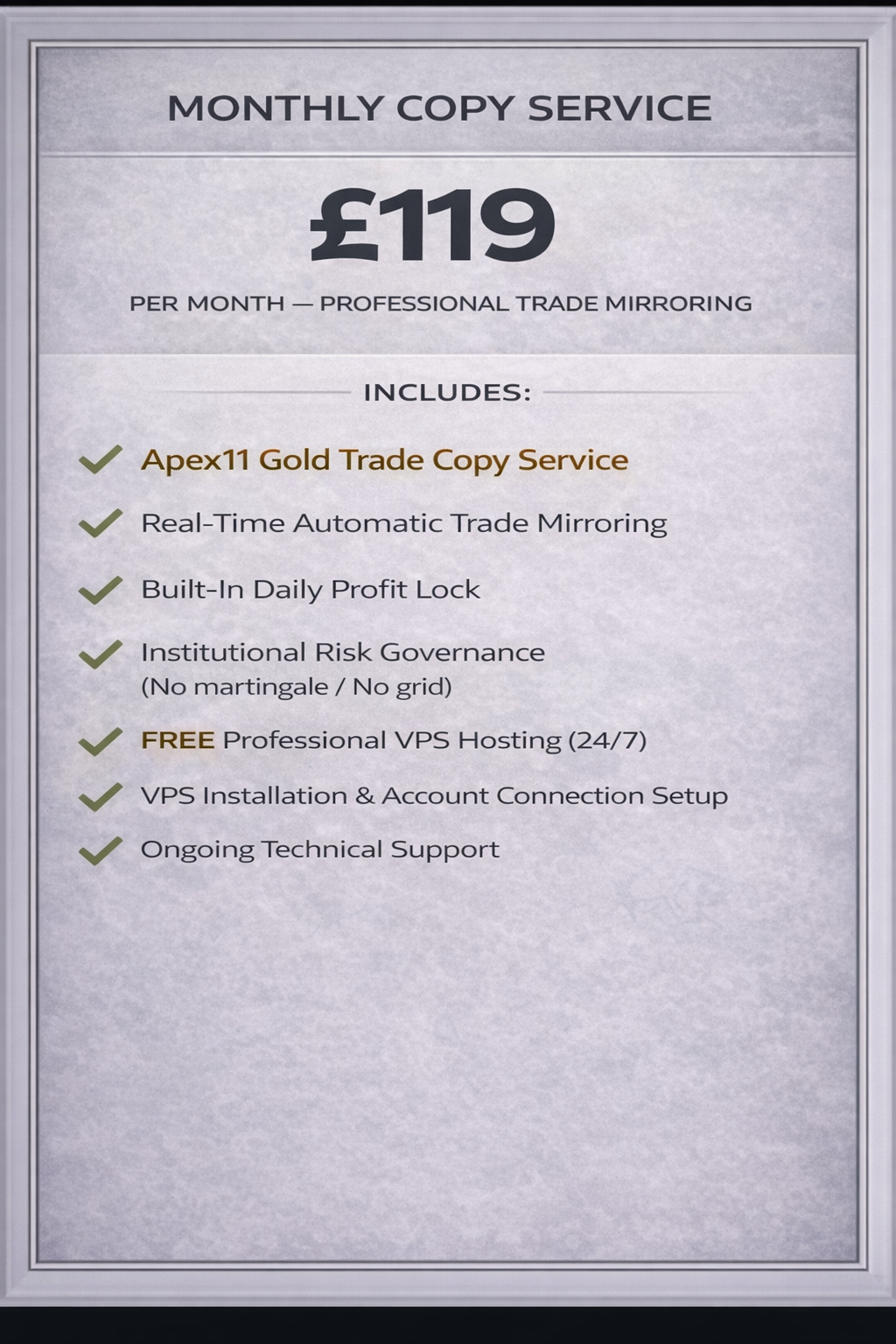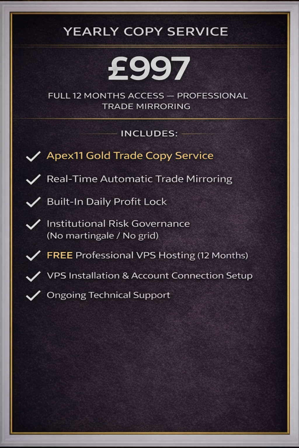 Choose Monthly or Yearly access, send your account details, and let our execution engine mirror every trade automatically — includes FREE professional VPS hosting.